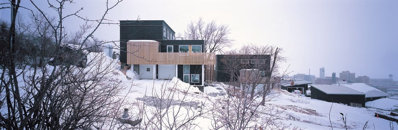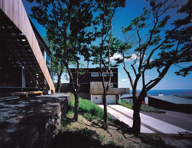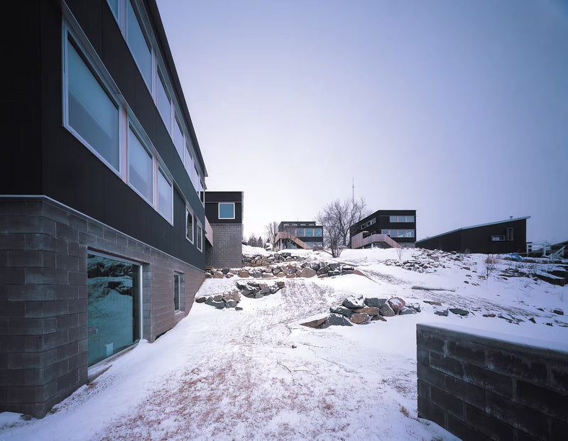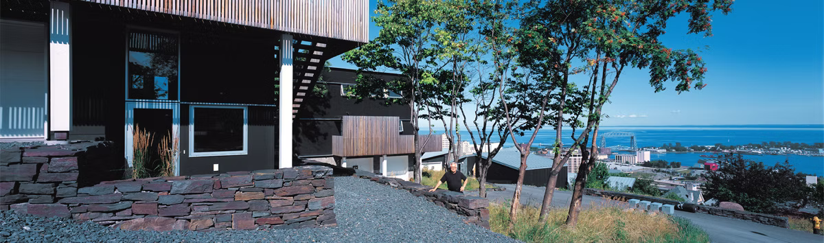 Situated in Duluth, Michigan, this black-cube multifamily development is planned with a European court quality that obscures property lines in an area that once housed the right-of-way for a long disused incline rail system. Old homes in the neglected neighborhood were demolished, utilities were buried, and plats were reconfigured to respond to natural elevation shifts and frame views of the Lake Superior harbor.