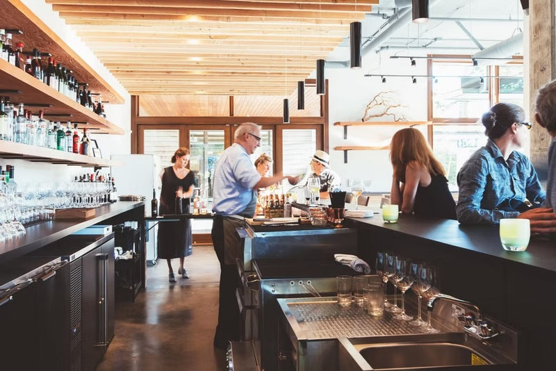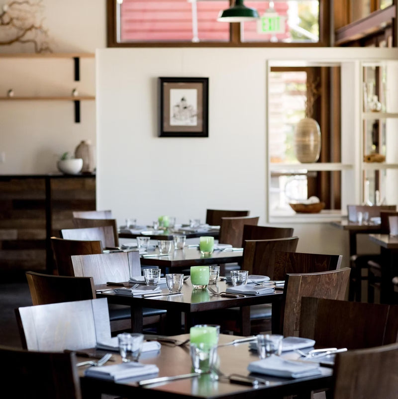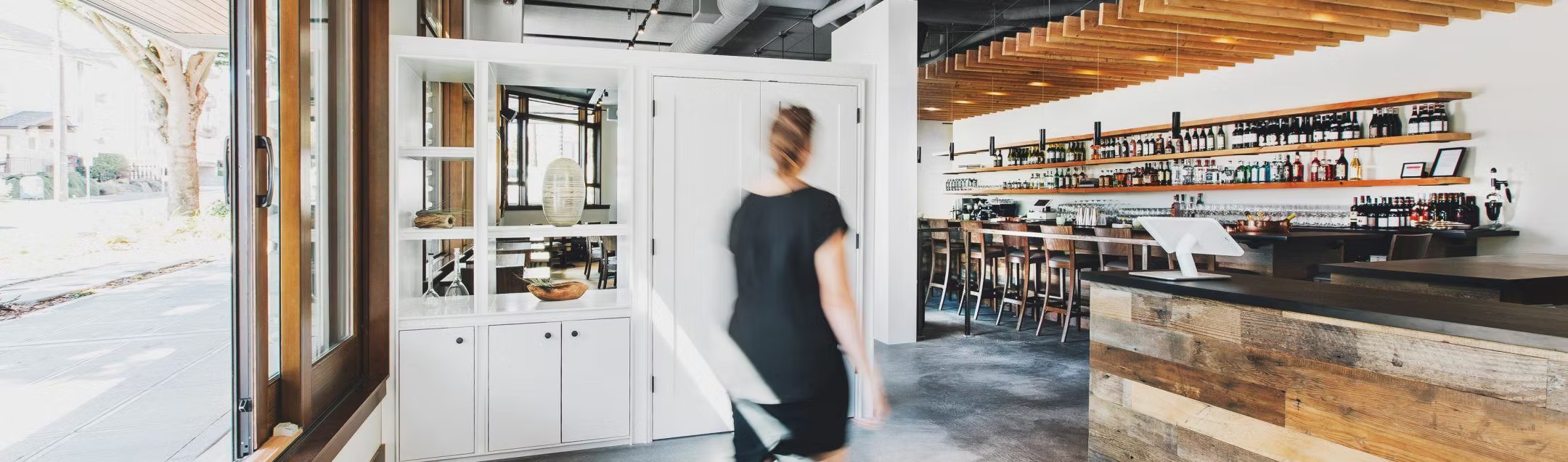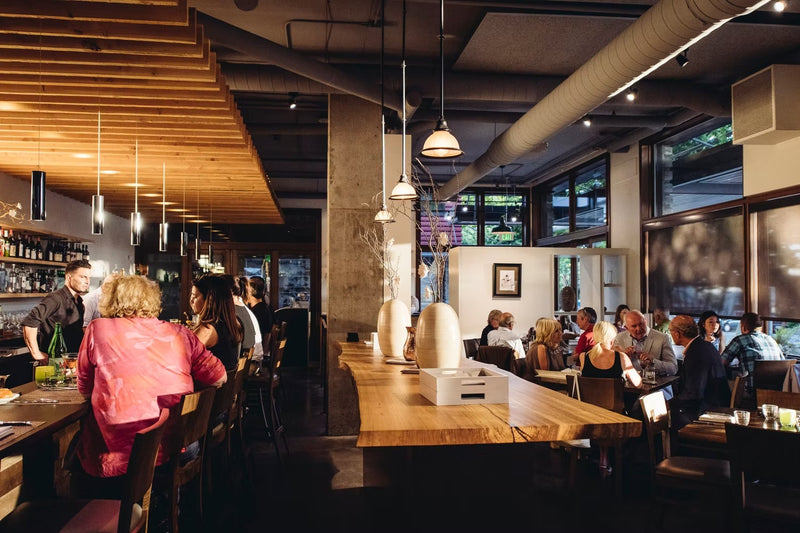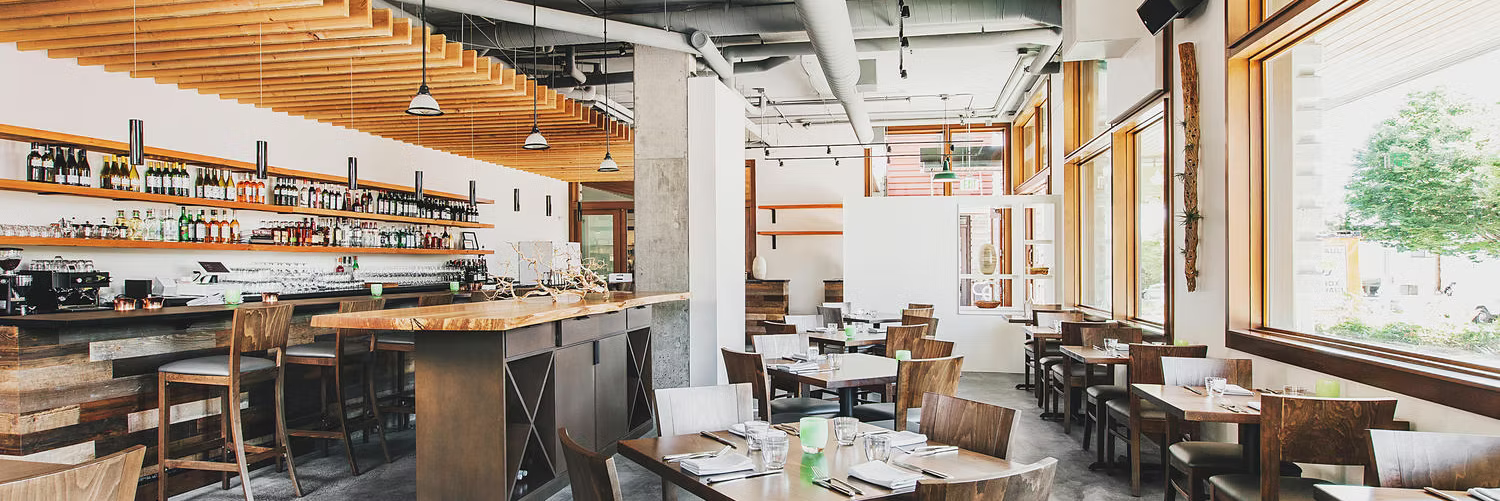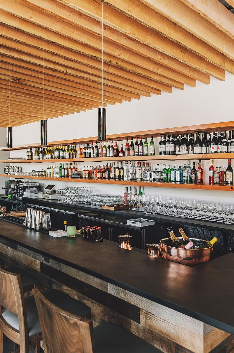 Located in Seattle's Ballard neighborhood, Copine occupies a prominent corner of a mixed-use building with large windows on three sides. Traditional and contemporary furniture elements are combined with reclaimed and adapted materials to create a refined, warm material palette.