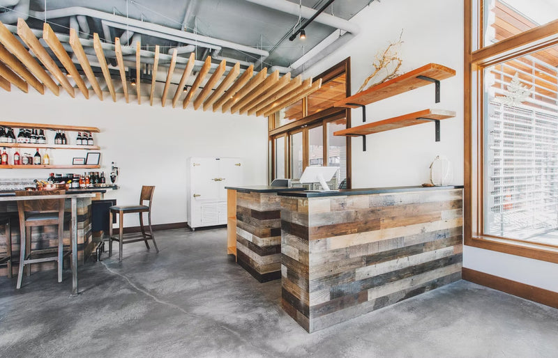 The long bar, featuring reclaimed wood and topped with a deep metallic shade of Richlite, acts as an intimate space for dining and drinks.