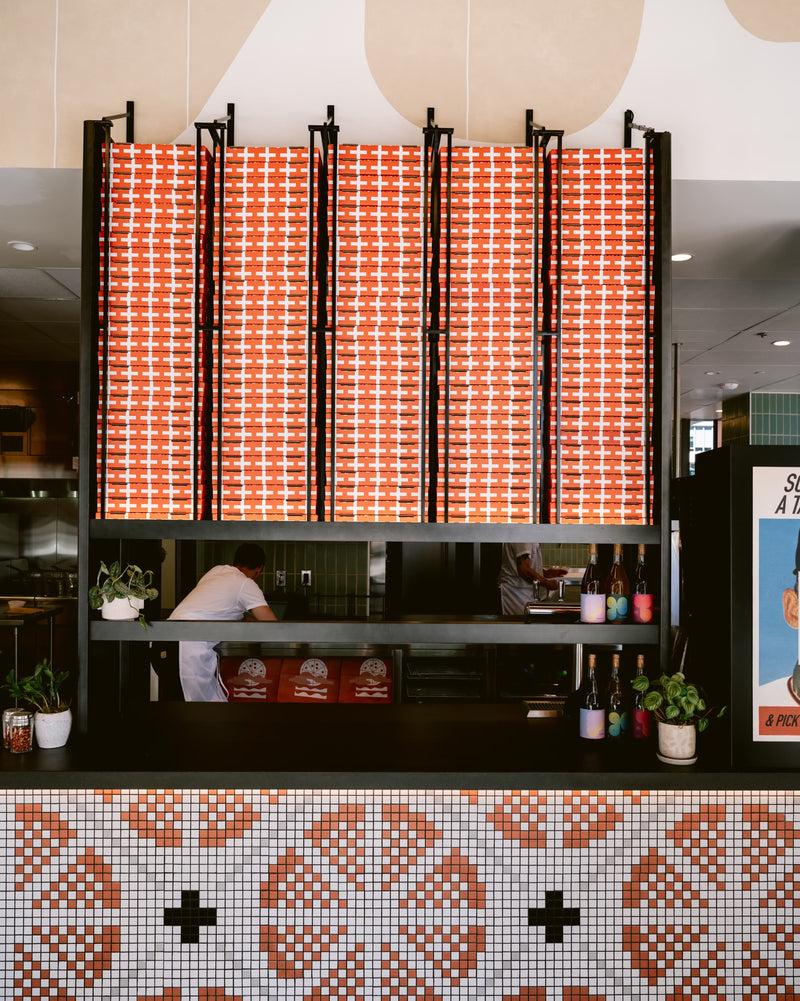 Large street-facing windows provide passersby with a glimpse of the pizza-making process, adding to the shop's charm. Custom tilework, neon signage, and a mural by local artist Nicole Hayden enhance the visual appeal without overwhelming the senses.