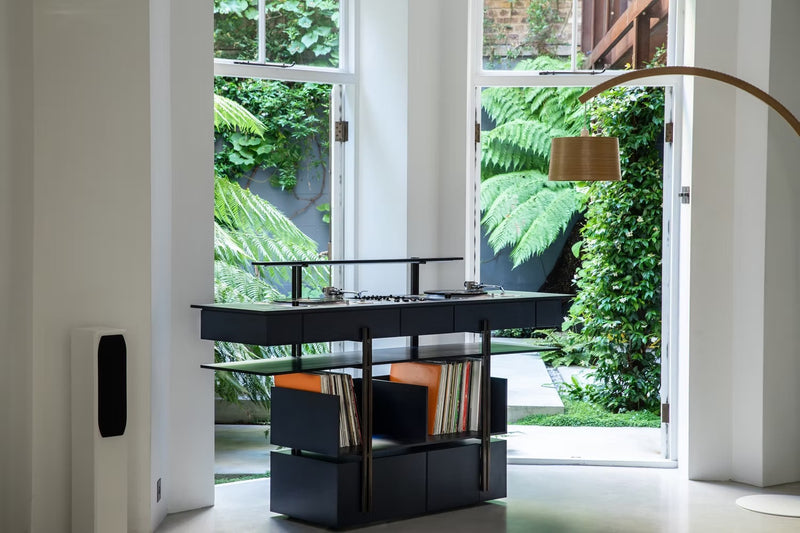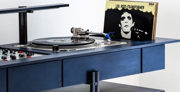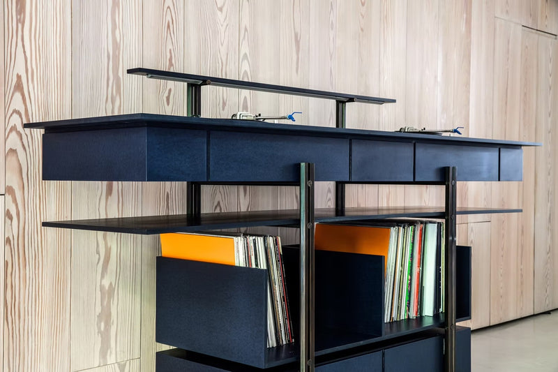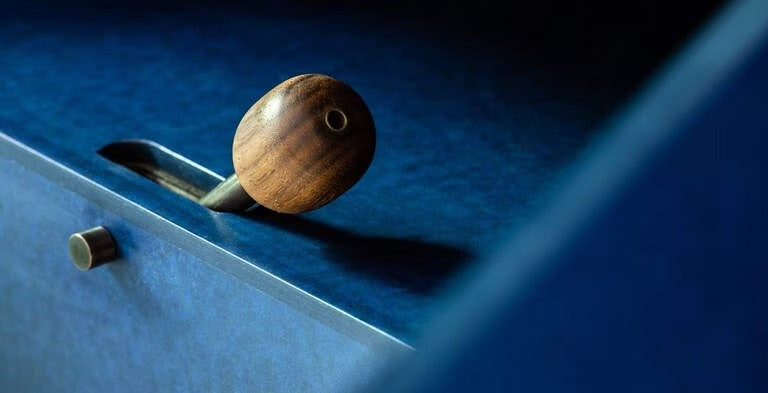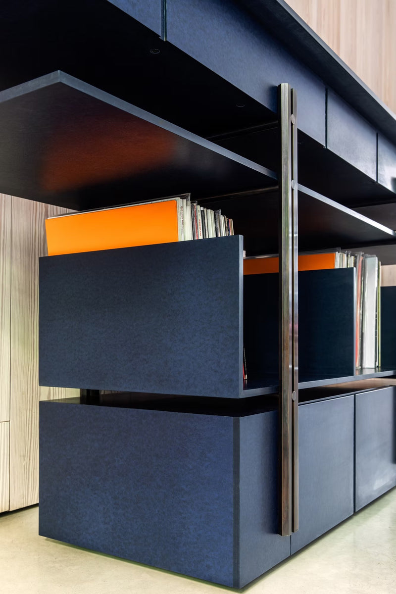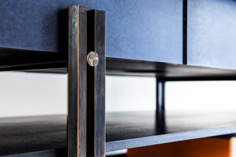 Studio in Place created the completely unique and visionary cabinet, Rietveld Remix, inspired by Gerrit Rietveld's 'Elling' sideboard, using Richlite Blue Canyon. The modern look of the cabinet echoes designer Adam Blencowe's contemporary style through examining traditional techniques through deep blues and patinated blacks that contrast with the bold brass finishes.