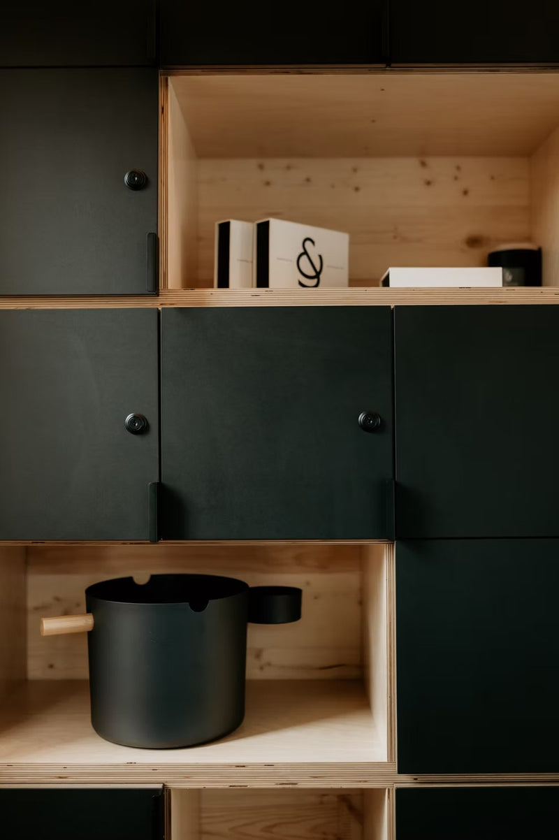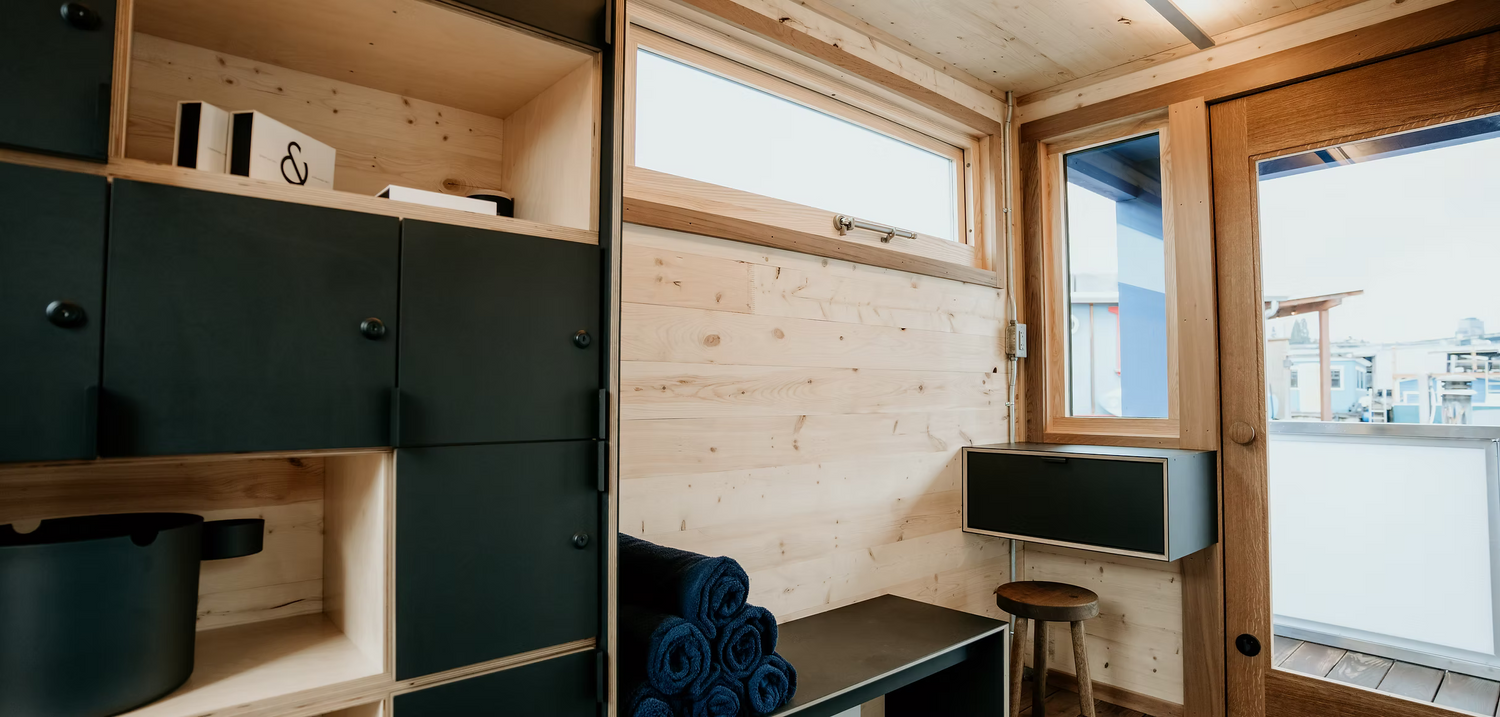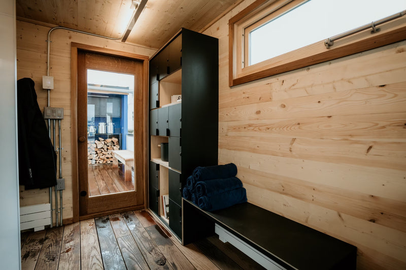 Moored on Lake Union, the Seattle Sauna Co. is a floating sauna that faces constant exposure to marine air and moisture. Cedar & Stone used Richlite to craft built-in lockers in the entry space, offering a sleek, durable alternative to traditional metal. The result is a seamless, intentional design that stands up to heavy use and humidity.
